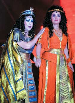 盡管專業(yè)氣象臺一直預(yù)報(bào)演出時(shí)無雨,但是昨天一天的天氣都十分陰沉,讓人不禁為這場演出捏了一把汗。可是老天有眼,到了傍晚時(shí)天氣變得格外的好。當(dāng)晚八時(shí),《阿依達(dá)》在萬眾企盼中終于熱鬧開場。一陣優(yōu)美的前奏之后,美麗的埃塞俄比亞公主阿依達(dá)翩然出場。金字塔在絢麗燈光的映襯下,透著迷人的光暈。冰島男高音歌唱家克里斯蒂安·約翰遜扮演的男主角拉達(dá)梅斯、意大利著名男低音歌唱家佳尤蒂扮演的大祭司等劇中角色依次出場,洪亮的嗓音和優(yōu)美的唱腔不時(shí)博得觀眾的陣陣掌聲。