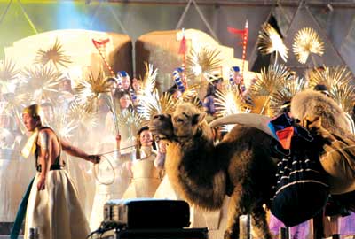 當(dāng)晚演出的高潮出現(xiàn)在第二幕第二場。在雄壯有力的凱旋進(jìn)行曲聲中,兩千名由武警戰(zhàn)士扮演的身穿戰(zhàn)袍的勇士邁著整齊的步伐走過這個世界上最大的舞臺,上千名歡慶勝利的群眾在舞臺上載歌載舞,而繳獲的戰(zhàn)利品——駱駝、老虎、獅子等動物明星們的出場以及在體育場看臺四周齊放的絢麗的煙花更增添了歡慶的節(jié)日氣氛。這時(shí),工人體育場一下子沸騰了,觀眾們被眼前盛大的場景深深感染了,臺上臺下歡呼聲響成一片,首屆北京國際戲劇演出季掀起了第一個高潮。