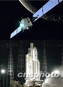 歐洲第一個(gè)月球探測器“靈敏-1”號,于北京時(shí)間周日上午7點(diǎn)14分搭乘歐洲“阿麗亞娜-5”型火箭從法屬圭亞那地區(qū)庫魯航天中心成功發(fā)射升空。與“靈敏-1”號同時(shí)發(fā)射升空的還有兩枚商用衛(wèi)星。預(yù)計(jì)15個(gè)月后,重370公斤的“靈敏-1”號探測器,將到達(dá)繞環(huán)月軌道,在月球軌道上工作30個(gè)月。中新社圖