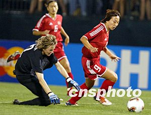 已在世界杯上打進十一球的孫雯在第二十九分鐘時險些平了美國人保持的世界杯個人進球紀(jì)錄,她在對方禁區(qū)內(nèi)頭球沖頂,球打在立柱上彈出。