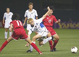 因為同組的加納隊在先進行的另外一場比賽中出人意料地以二比一戰(zhàn)勝善擺“鐵桶陣”的澳大利亞隊,把中國隊提前送進八強,這無疑給中國隊員減輕了很大的心理壓力。必須取勝才能以小組第一的身份出線的中國隊一開場就對俄隊的陣地展開了猛攻,而俄隊并沒有像人們賽前預(yù)料的那樣收縮密集防守,而是與中國隊展開對攻。中國隊兇狠的中場搶截使俄隊難以組織起像樣的進攻,而有了中場有力支持,中國隊鋒線上的兩把尖刀孫雯和白潔開始顯現(xiàn)應(yīng)有的威力,俄隊門前險情不斷。