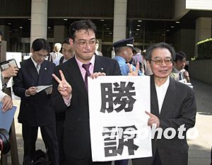 法庭內,判決結果只宣布到一半,日本律師團的幾位年輕辯護律師就已經抑制不住激動地舉起拳頭,有的還興奮地和在場中國原告握起手。不懂日語的原告李臣在弄明白判決結果后,頓時百感交集,淚水橫流。小姑娘劉敏懷抱著父親的遺像早已泣不成聲。而此時旁聽席上也響起了掌聲和叫好聲,使判決書的宣讀中斷了數秒。