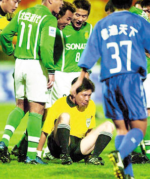 據(jù)新聞晨報報道,這個判罰激怒了北京隊員,外援雷吉納爾多沖向楊志強,一把推搡之下瘦弱的裁判被摔倒在地。這一暴力舉動迅速激化了場上局勢,北京隊數(shù)名隊員沖了過來,圍住楊志強,國安俱樂部工作人員也沖入場內(nèi)指責裁判。兩個邊裁也來到楊志強附近,擔當起保衛(wèi)同盟者的職責。賽區(qū)監(jiān)督眼見形勢不妙,指揮數(shù)十名警察涌入場內(nèi)維持秩序。那個時候的鞍山賽場已亂成了一團粥,比賽也因此延時5分鐘。