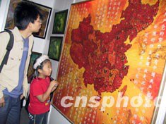 第六屆北京國際藝術(shù)博覽會“十一”黃金周期間在北京舉行。博覽會展出中外藝術(shù)家作品共一萬多件,圖為一幅由2001枚毛主席像章拼成的中國版圖油畫。中新社記者:張勤