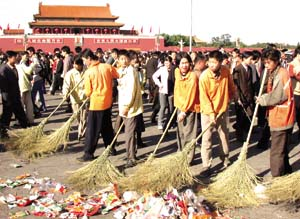 “我們前面掃過去,發(fā)小廣告的在后面發(fā),掃的還沒有發(fā)的快!弊蛱,東城區(qū)環(huán)衛(wèi)局專業(yè)管理科張德良這樣抱怨道,“我們東城、西城等四個區(qū)的環(huán)衛(wèi)工人在天安門廣場從早上5點到晚上9點連續(xù)作業(yè),也掃不凈!