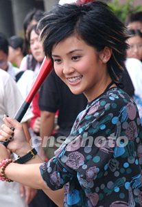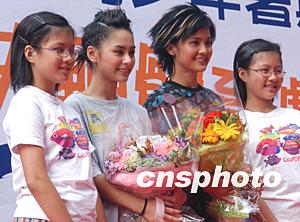 香港樂壇人氣組合TWINS,十月四日出席在香港理工大學(xué)舉辦的青少年體育嘉年華活動(dòng),兩名理大學(xué)生向TWINS獻(xiàn)花。中新社記者:錢興強(qiáng)