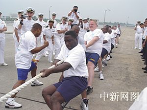 23日,中美海軍首先進(jìn)行了拔河友誼比賽。拔河比賽應(yīng)該說是中國海軍水兵的強(qiáng)項,在97年南海艦隊對美洲四國五港的訪問中,中國海軍水兵拔河隊一路上攻城拔寨、未嘗敗績。但這次美國水兵拔河隊是有備而來,且來者不善。15名隊員個個膀大腰圓、粗壯結(jié)實,比如,其中一名黑人隊員桑塔納(SANTANA),此人身高199CM,體重250斤,來自美國亞特蘭大,是艦上的武器部門人員。中方隊員與對手相比在塊頭上明顯吃了虧,處于劣勢。比賽開始前,美方隊員圍在一起,大聲鼓勁。比賽開始后,中方水兵拔河隊奮力與對手展開拉鋸戰(zhàn),雖拼盡全力,無奈實力稍遜一籌,最后不無遺憾地輸?shù)舯荣悾绹菜銏罅松洗伪荣惖囊患稹?/p>