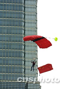下午三時(shí)許,挪威跳傘家特杰·霍爾沃森從金茂大廈樓頂縱身躍下,成為此次跳傘表演活動(dòng)的“第一跳”,身著紅衣的霍爾沃森在躍出跳臺(tái)后很快打開(kāi)紅色的降落傘,并在空中展開(kāi)一面中國(guó)國(guó)旗。特杰·霍爾沃森降落后表示,此次表演令他留下了最為深刻和難忘的印象。
