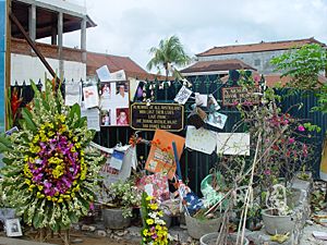 據(jù)介紹,巴厘島當(dāng)局原打算在這塊空地上建一座紀(jì)念碑,但因有爭議,被擱置了下來。在街道左邊的小三角形地段,建筑工人正在鋪設(shè)路面。對面一座新商店已開始營業(yè),臨近的“泛印尼銀行”還修筑了一道新圍墻,樓頂加蓋了藍(lán)瓦新頂。除了這塊尚不知作何用途的空地以外,爆炸案現(xiàn)場已漸漸和庫塔街融為一體。