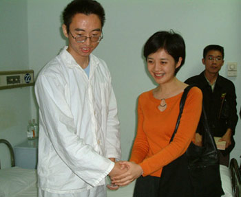 9月26日,鳳凰衛(wèi)視知名女主播、“華夏愛心團愛心專員”許戈輝,手捧鮮花,來到空總血液科病房慰問身患MDS骨髓增生異常綜合癥的貧困大學生干海濤,并現(xiàn)場捐贈一萬元。北京太陽宮房地產(chǎn)有限公司總經(jīng)理韓國建也代表華夏愛心團捐助了現(xiàn)款,并邀請海濤在“牽手愛心墻”的采集印上按下了自己的手印。