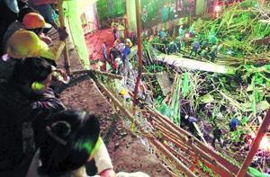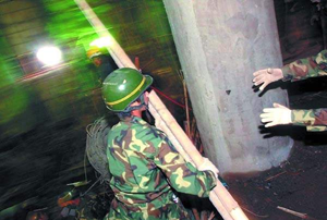 昨天晚上8時(shí)30分,記者在搶險(xiǎn)現(xiàn)場(chǎng)守侯,一名因疲勞過(guò)度的三水拆船廠的搶險(xiǎn)工人從工地走出來(lái),記者立即圍上前詢問(wèn)現(xiàn)場(chǎng)搶險(xiǎn)救援的情況。該工人說(shuō),他們是昨天上午11時(shí)許接到拆船廠負(fù)責(zé)人的指示,要他們立即集合前往新會(huì)一發(fā)生倒塌事故的建筑工地上救人,于是他們穿上工作服就來(lái)了。據(jù)介紹,他們大約來(lái)了30人左右,分為三班倒。他們實(shí)施搶救的主要步驟時(shí),首先將高空中墜落地面的大約100多平方米的鐵板用電焊將他們燒開(kāi),用大型的吊車(chē)將鐵板吊開(kāi),然后再將壓在地下的工人從鐵板下“拔”出來(lái)。主要的困難是鐵板從高空墜下,其速度非常快,在慣性的作用下,將眾多的雜物如竹子、木頭、鐵棍等夾雜在其中。預(yù)計(jì)下面被埋的還有10人左右,他們正與搶險(xiǎn)的其他工人爭(zhēng)分奪秒,估計(jì)將通宵搶險(xiǎn)。