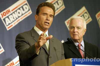 中新社洛杉磯十月八日電 美西時(shí)間十月七日深夜,毫無從政經(jīng)驗(yàn)的好萊塢影星阿諾·施瓦辛格當(dāng)選為加州州長。投票結(jié)果明朗后,他發(fā)表演講,稱自己一無所有來到加州,加州卻給了他一切;最重要的是,給了他信任。
