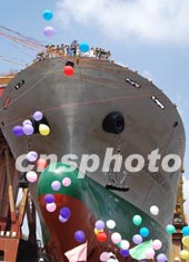 中新社上海十月九日電(記者褚婷婷)為適應(yīng)運輸輕軌列車等大型設(shè)備的需要,載重三萬噸的多用途重吊貨輪——“中波明月”號,今天中午在上海船廠二號船臺下水。據(jù)悉,這種貨輪是當(dāng)今世界件貨航運市場上最先進、規(guī)模最大的運輸工具,它的建成及不久后的投入營運,將有力提升中國在世界雜貨運輸航線上的競爭力。