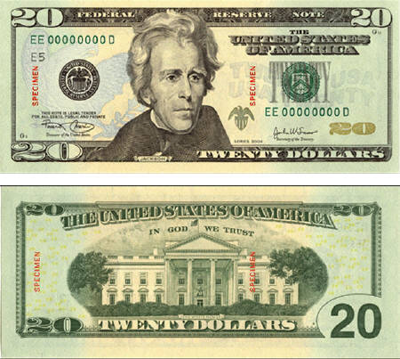 新版美鈔保持了傳統(tǒng)美鈔的外貌,尺寸亦沒(méi)有改變,鈔票的正反面也仍然是安德魯·杰克遜的圖像和白宮的圖案,只是色彩有所增強(qiáng)。新版二十美元是美國(guó)近代史上首次用多種顏色而非單一綠色印刷的鈔票,除了傳統(tǒng)的綠色以外,鈔票底色是桃色,上有藍(lán)色的鷹形圖案和銅色數(shù)字。