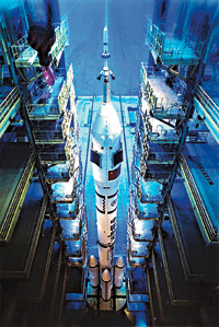 托舉著“神舟”五號(hào)載人飛船的“長征”二號(hào)F型火箭目前已矗立在酒泉衛(wèi)星發(fā)射中心發(fā)射塔架上,中國首次載人飛船發(fā)射已進(jìn)入倒計(jì)時(shí)。(圖片來源:香港大公報(bào),美聯(lián)社發(fā))