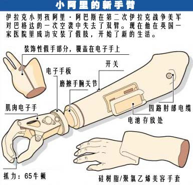 新的手臂是在倫敦的瑪麗女王學院安裝的,手術(shù)費用由科威特政府支付。阿里的左臂只能起到美容的目的,因為他原來的左臂幾乎被全部炸掉了。他的右臂假肢則由電極操縱其剩下來的手臂肌肉。