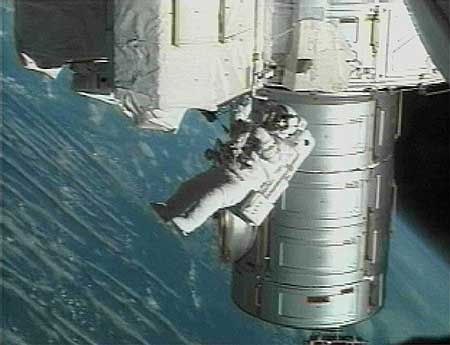 2002年2月20日,國際空間站第四長期考察組的美國宇航員伯施對高壓氮氧艙進行了檢查。國際空間站的宇航員首次在沒有航天飛機對接的情況下實施太空行走。新華社圖