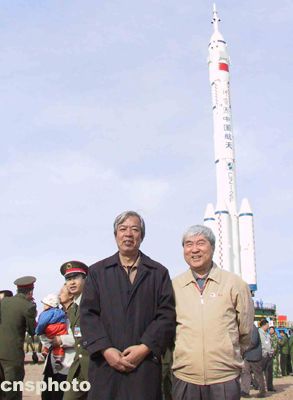 “神舟”五號(hào)載人飛船總設(shè)計(jì)師戚發(fā)軔(右)和“神箭”——長征二號(hào)F運(yùn)載火箭總設(shè)計(jì)師劉竹生在箭船塔組合體垂直轉(zhuǎn)運(yùn)現(xiàn)場(chǎng)合影留念。中新社記者孫自法攝