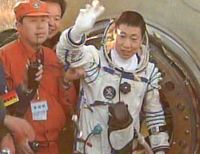 中國首位航天員楊利偉乘坐的“神舟”五號載人飛船,于北京時間十月十五日九時,在酒泉衛(wèi)星發(fā)射中心用“長征二號F”型運載火箭發(fā)射升空。