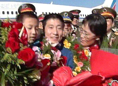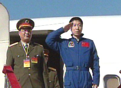 中新社北京十月十六日電 十六日上午,剛剛隨“神舟”五號飛船安全返回地面的中國首位航天員楊利偉,乘專機(jī)從內(nèi)蒙古著陸場飛抵北京。中共中央政治局委員、中央軍委副主席、國務(wù)委員兼國防部長曹剛川在中央軍委委員、總裝備部部長、載人航天工程總指揮李繼耐和總裝備部政委遲萬春的陪同下到機(jī)場迎接。