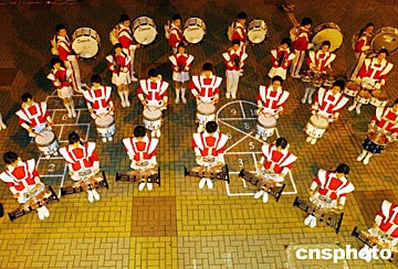 香港工聯(lián)會十六日晚在秀明小學(xué)舉行慶;顒樱YR中國首次載人飛船上太空成功,氣氛熱烈。圖為慶祝會上的步操敲擊樂表演。作者:洪少葵