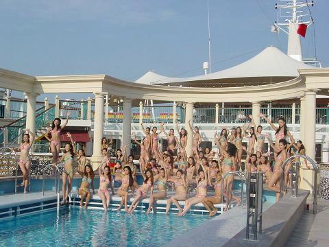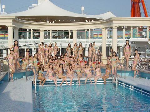 當(dāng)佳麗們乘坐的麗星郵輪獅子星號從香港行駛到?跁r,身著三點式泳裝的50名佳麗宛如出水芙蓉,驚艷“獻身”在郵輪上的露天游泳池旁。面對攝像鏡頭和船上中外游客發(fā)出的驚嘆聲,佳麗們自信的展現(xiàn)各種姿態(tài)。