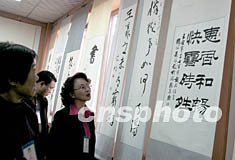 十七日,從國內外書畫名家中的七百余幅書畫佳作,在整修后的王羲之故居舉行展覽,國內外一千多名參加書圣文化藝術節(jié)的嘉賓興致勃勃參觀展覽。中國書法協(xié)會會長沈鵬、副會張劉炳森等大名家的作品更是引人注目。中新社記者:王麗南