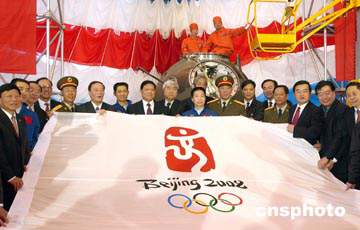 十月十八日,中國(guó)神舟五號(hào)載人飛船回收艙搭載物品開艙儀式在中國(guó)航天科技集團(tuán)公司北京空間技術(shù)研制試驗(yàn)中心舉行。中國(guó)首位航天員楊利偉、北京奧組委主席劉淇、中國(guó)載人航天工程總指揮李繼耐等共同展示從太空歸來(lái)的2008北京奧運(yùn)會(huì)會(huì)徽旗幟。中新社記者:張煒