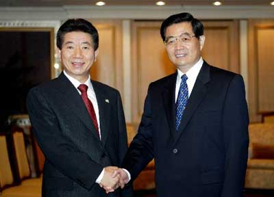 胡錦濤對盧武鉉說:今年7月你訪問中國時,我們雙方?jīng)Q定建立中韓全面合作伙伴關(guān)系,并確定了雙邊合作的重點領(lǐng)域。在這一精神的推動下,兩國在各方面的合作都取得了新的進展。兩國領(lǐng)導(dǎo)人經(jīng)常見面體現(xiàn)了我們之間的良好關(guān)系。目前,兩國經(jīng)貿(mào)合作發(fā)展迅速,今年1月至9月,雙邊貿(mào)易額已達440億美元。我們認為,中韓關(guān)系的順利發(fā)展,友好合作的不斷擴大,為中韓兩國人民帶來了實實在在的利益。希望雙方進一步共同努力,積極開拓,將中韓全面合作伙伴關(guān)系落到實處。