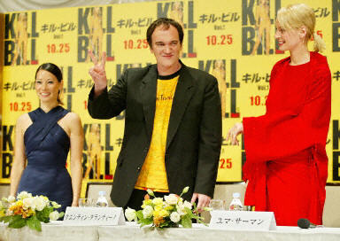 10月19日,美國導(dǎo)演昆汀·塔倫蒂諾(中)、好萊塢著名影星烏瑪·瑟曼(右)和劉玉玲在日本東京出席最新動(dòng)作片《殺死比爾》的新聞發(fā)布會(huì)。該片由塔倫蒂諾執(zhí)導(dǎo),瑟曼、劉玉玲主演,將于10月25日在日本公映。