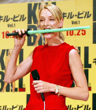 好萊塢著名影星烏瑪·瑟曼19日在日本東京出席由她主演的最新動(dòng)作片《殺死比爾》的新聞發(fā)布會(huì)。