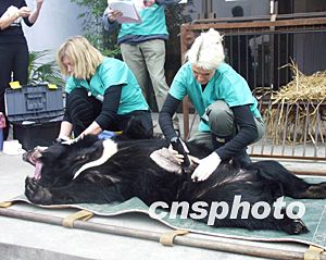 亞洲動物基金10月24日在成都中醫(yī)藥大學(xué)召開的“熊膽替代研討會”上宣稱,該基金正式啟動的“拯救黑熊、棄用熊膽”的熊膽替代宣傳教育系列行動揭開序幕,以讓更多的亞洲黑熊得到保護(hù)和救助,最終實現(xiàn)在中國淘汰活熊取膽業(yè)的目標(biāo)。圖為“四川龍橋黑熊救護(hù)中心”的外籍獸醫(yī)為剛從養(yǎng)熊場解救出的亞洲黑熊體檢。作者:魯彥