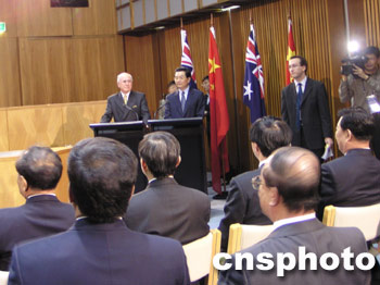 中國國家主席胡錦濤和澳大利亞總理霍華德10月24日在聯(lián)邦大廈聯(lián)合會(huì)見中澳記者。作者:劉雨生