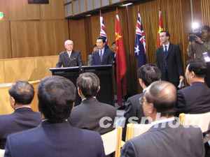 中國(guó)國(guó)家主席胡錦濤和澳大利亞總理霍華德10月24日在聯(lián)邦大廈聯(lián)合會(huì)見中澳記者。中新社記者 劉雨生 攝