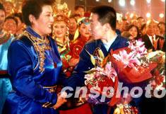 二十四日晚,北京舉行大型文藝晚會(huì)《圓夢(mèng)》慶祝中國(guó)首次航天飛行圓滿成功。著名歌唱家德德瑪代表觀眾向航天英雄楊利偉獻(xiàn)花。作者:王玉