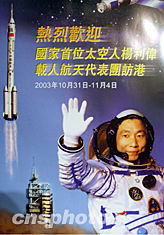 中國(guó)首位航天員楊利偉載人航天代表團(tuán)十月三十一抵香港進(jìn)行訪問(wèn),為歡迎國(guó)家首位航天員楊利偉的到來(lái)香港貼出醒目海報(bào)。中新社記者:錢興強(qiáng)