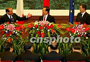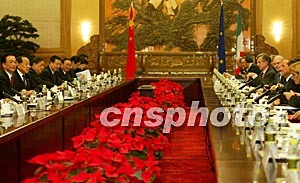 中歐領(lǐng)導(dǎo)人第六次會(huì)談三十日在北京舉行。中國(guó)國(guó)務(wù)院總理溫家寶、歐洲理事會(huì)主席意大利總理貝盧斯科尼、歐盟委員會(huì)主席普羅迪等出席會(huì)談。鄭萍萍 攝