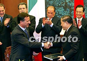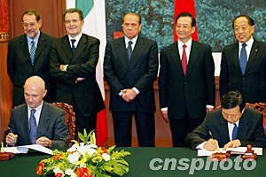 中國(guó)與歐盟三十日在北京簽署伽利略衛(wèi)星導(dǎo)航合作協(xié)定等三個(gè)文件。中國(guó)國(guó)務(wù)院總理溫家寶、歐洲理事會(huì)主席意大利總理貝盧斯科尼(左三)、歐盟委員會(huì)主席普羅迪(左二)、歐盟共同外交與安全政策高級(jí)代表索拉納(左一)等出席簽字儀式。鄭萍萍 攝