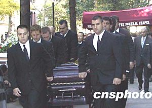 “中央社”報(bào)道說,十位工作人員將古銅色的棺木抬上靈車,由兩部警車開道,靈車和十余部家屬乘坐的禮車緩步前行。