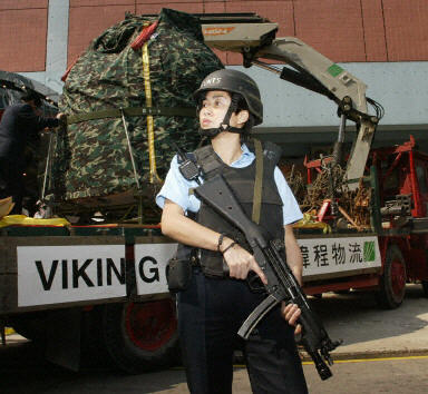 “神舟”五號(hào)載人飛船返回艙中午前由飛機(jī)運(yùn)抵香港機(jī)場,現(xiàn)正等候送往科學(xué)館,準(zhǔn)備在航天展展出。圖為香港警察嚴(yán)密護(hù)衛(wèi)。