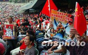 香港各界周六在香港大球場舉行歡迎楊利偉大會,圖為大球場座無空席觀眾手舉各種歡迎楊利偉海報歡呼雀躍。中新社記者:錢興強