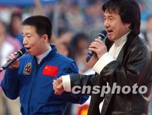 中國首位航天員楊利偉與香港明星成龍,周六在香港大球場舉行的歡迎楊利偉大會上演唱歌曲《男兒當(dāng)自強》。中新社記者:錢興強