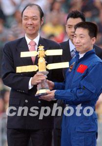 周六在香港大球場舉行的各界歡迎中國首位航天員楊利偉大會上,香港人士向楊利偉贈送“黃金美鉆神舟五號飛船”紀(jì)念品。 中新社記者:錢興強