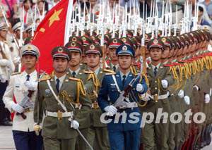 周六在香港大球場舉行的各界歡迎楊利偉大會上,駐港部隊三軍儀仗隊一展英姿。中新社記者:錢興強