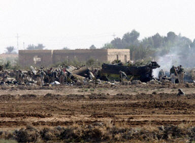 駐伊美軍發(fā)言人說,目前已證實2日在巴格達附近被擊落的美軍運輸直升機造成13人死亡,至少20人受傷。圖為墜落在費盧杰的美軍用直升機失事現(xiàn)場。