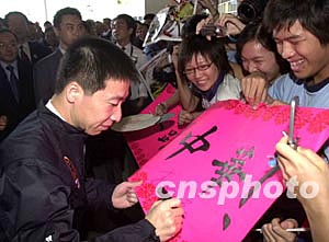 圖為楊利偉在歡迎的橫幅上簽名。
