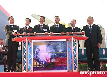 五日在澳門金蓮花廣場舉行“國家首飛航天員楊利偉和載人中國載人航天代表團(tuán)訪澳歡迎儀式暨中國首次載人航天飛行展開幕典禮”盛大儀式,圖為澳門特區(qū)行政長官何厚鏵、全國政協(xié)副主席馬萬祺、楊利偉等主持開幕儀式。中新社記者:李剛