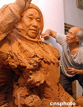 中國(guó)著名雕塑藝術(shù)家曹崇恩,近日正在為中國(guó)首次乘載人飛船登上太空的航天員楊利偉塑像,該像落成后將作為愛(ài)國(guó)主義教育作品展立在廣州曹崇恩雕塑園。圖為七十三歲的曹崇恩教授全神貫注為中國(guó)首飛太空航天員楊利偉塑像。中新社記者:錢(qián)興強(qiáng)