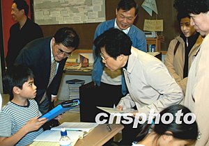 國務(wù)院僑務(wù)辦公室主任陳玉杰(中)率團赴麻省劍橋市考察當(dāng)?shù)刂形膶W(xué)校教學(xué)情況。圖為她關(guān)切地向正在上中文課的九歲華裔男童何頌志(左)要考試試卷。中新社記者:陳建
