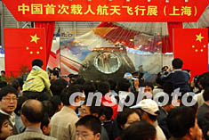 十一月九日,“神舟”五號返回艙亮相第五屆上海國際工業(yè)博覽會(huì),中國首次載人航天飛行展也同時(shí)在滬展出,吸引了眾多市民一早就來到展會(huì)現(xiàn)場一睹“神五”的風(fēng)采。作者:湯彥俊